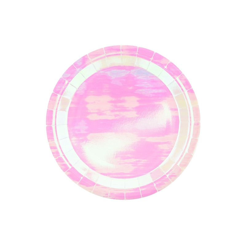 Décorez votre table de fête avec ces superbes assiettes carton de couleur rose à reflets. Ces assiettes jetable rose iridescent sont idéales pour compléter votre décoration à thème princesse, licorne ou tout autre fête.