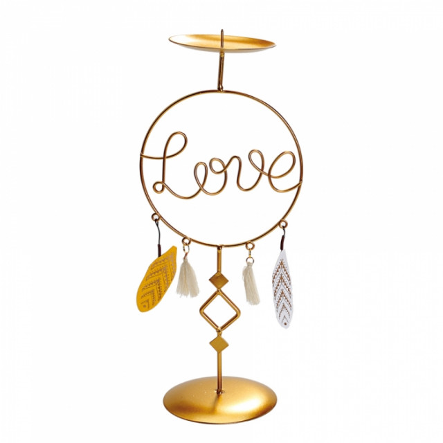 Magnifique bougeoir love sur pied doré en métal de 32 cm de hauteur sur 14 cm de large. Ce bougeoir est constitué d'un pic a son extrémité afin d'y fixer une la bougie de votre choix. Il sera idéal pour votre décoration de table de mariage, puisqu'il vous suffira d'en déposer un au centre de table de vos convives afin qu'il y règne une ambiance chaleureuse. Son cercle doré où y est inscrit "love" ainsi que ces pompons et plumes rappellent un attrape rêve