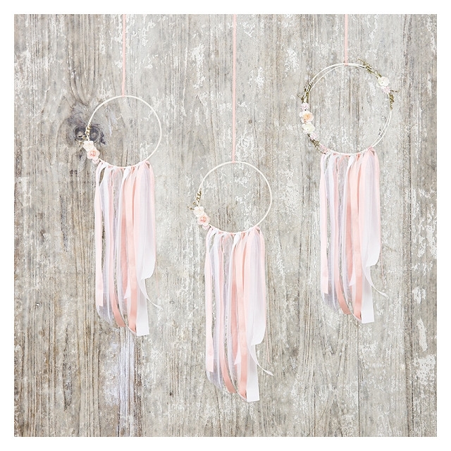 De couleur Blanc et Rose, ces attrapes rêves sont constitués d'un anneau centrale qui est décoré de petites fleurs blanches et roses, des rubans de même couleur sont accrochés à l'anneau. Vous pouvez également compléter votre décoration avec des guirlandes, des pompons, des lanternes et même des ballons de même couleur. Une décoration originale qui viendra séduire vos invités et sublimer votre lieu.