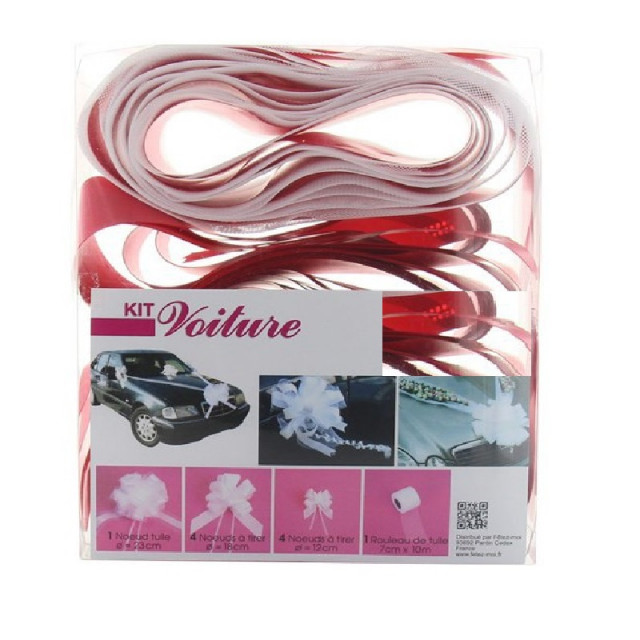 Kit décoration rouge pour voiture de mariage. Ce kit complet comprend: 1 nœud tulle 33 cm de diamètre, 4 nœuds 18 cm, 4 nœuds 12 cm, 1 rouleaux de tulle 7 cm x 10 mètres. Nœuds automatiques voiture mariage