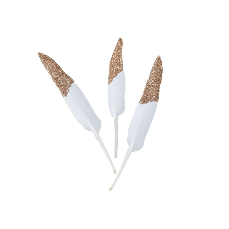 Lot de 10 plumes blanches de 12 cm de longueur. Chaque plume est décorée à la pointe avec une couleur rose gold pailletée, superbe effet.