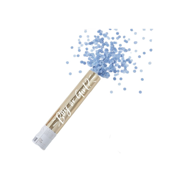 Tirez le canon pour dévoiler si votre nouveau né est un petit garçon ou une petite fille. Une manière originale de dévoiler la surprise a votre familles et amis lors de la célébration de la naissance. Des centaines confettis bleus sortirons pour annoncer la venue d'un garçon