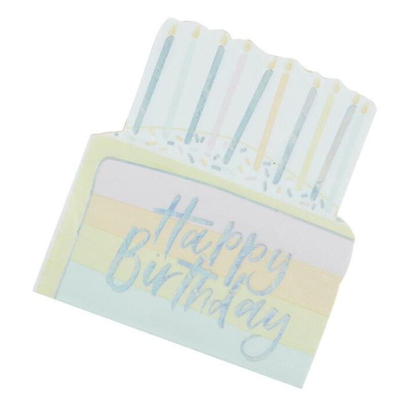 Vendues par paquet de 16 serviettes jetables anniversaire elles vont colorer vos tables et ravirons vos convives avec ces couleurs festives de ton pastel. La base du gâteau est composé de vert, rose, orange et le dessus est représenté par des bougies aux même teintes. Il est inscrit "happy birthday" de couleur irisé.