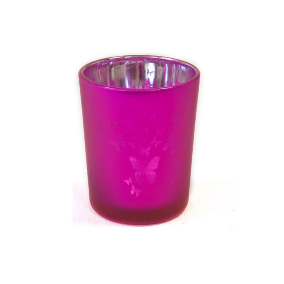 Apportez de la chaleur à votre décoration de table de noël avec ce magnifique photophore fuschia avec des motifs de papillon en verre.